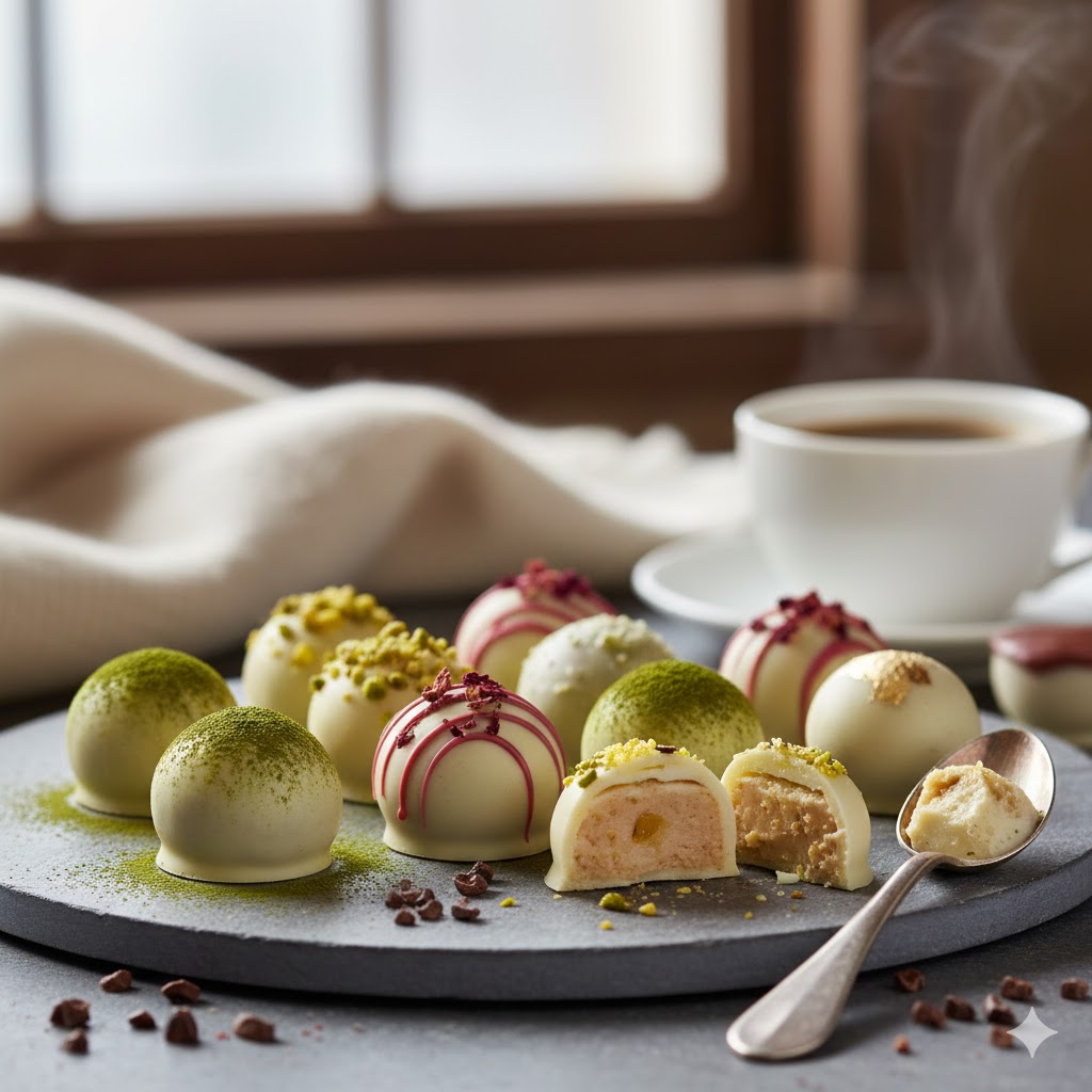 Το Πλάσιμο: Με ένα μικρό κουταλάκι παίρνουμε δόσεις από το μείγμα και πλάθουμε γρήγορα μικρά μπαλάκια με τις παλάμες μας (η λευκή σοκολάτα λιώνει εύκολα, οπότε μην τα κρατάτε πολλή ώρα στα χέρια).