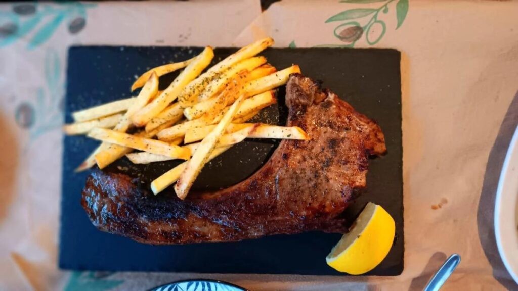 • Χοιρινή μπριζόλα, μαλακή και πλούσια σε γεύση — μια επιλογή που επιβεβαιώνει την προσοχή στη λεπτομέρεια του ψησίματος.