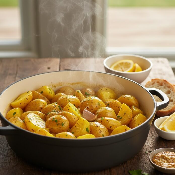 Το Φινίρισμα: Στο τέλος, ξεσκεπάζεις την κατσαρόλα και δυναμώνεις τη φωτιά για 2-3 λεπτά, ανακινώντας την κατσαρόλα κυκλικά (μην ανακατεύεις με κουτάλα για να μη σπάσουν), μέχρι να εξατμιστούν τα πολλά υγρά και να μείνουν οι πατάτες με το λάδι τους και μια δεμένη σάλτσα μουστάρδας.