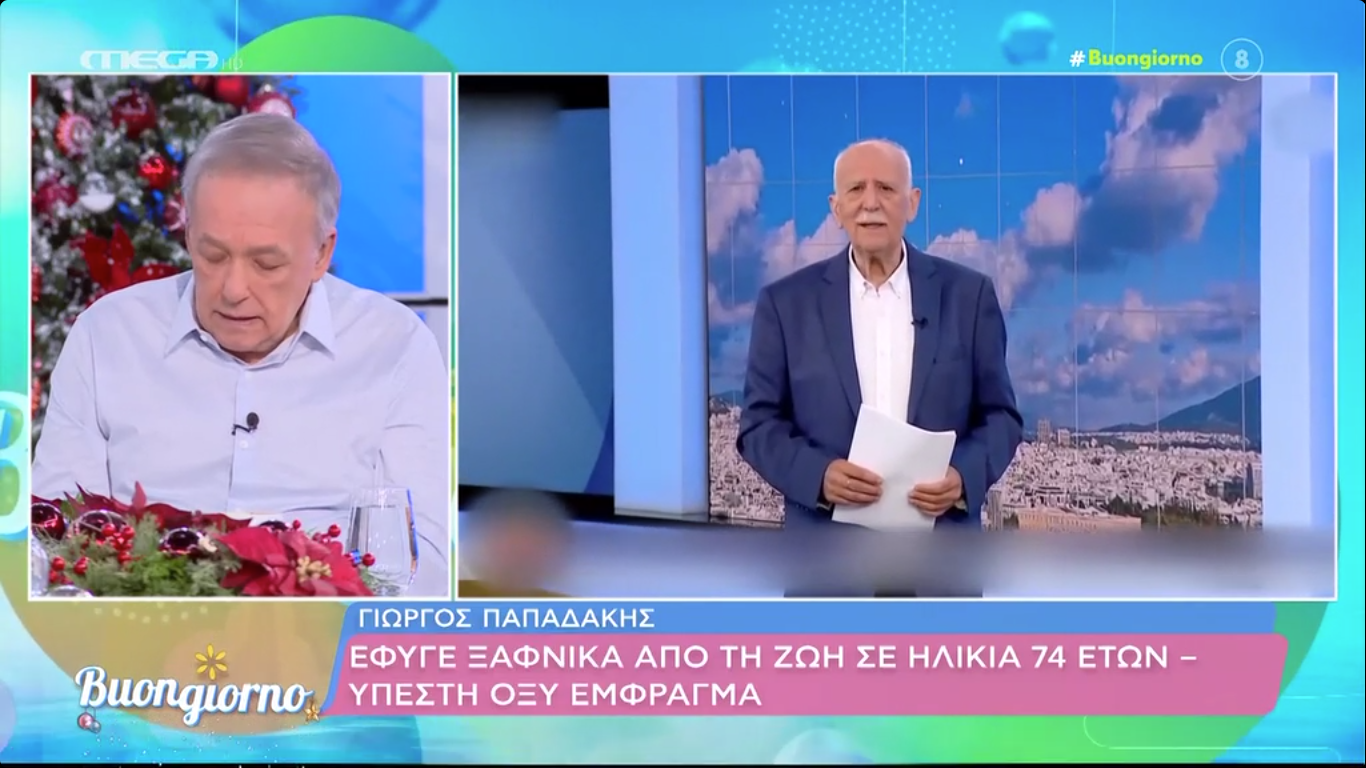 Βαθιά συγκλονισμένος εμφανίστηκε σήμερα ο Ανδρέας Μικρούτσικος στον αέρα της εκπομπής «Buongiorno». Η είδηση του θανάτου του Γιώργου Παπαδάκη βύθισε στο πένθος το πανελλήνιο, καθώς ο εμβληματικός δημοσιογράφος και παρουσιαστής υπήρξε ιδιαίτερα αγαπητός και σεβαστός από όλους.
