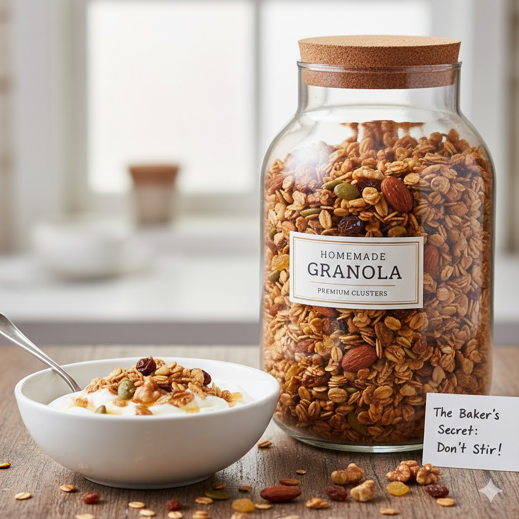 Σταματήστε να αγοράζετε πανάκριβα πακέτα δημητριακών που είναι γεμάτα κρυμμένη ζάχαρη. Η σπιτική γκρανόλα δεν είναι μόνο πιο οικονομική, αλλά είναι και το απόλυτο “custom” σνακ. Η μυρωδιά της κανέλας και του μελιού που καραμελώνουν στον φούρνο θα σας πείσει από το πρώτο λεπτό. Είναι το τέλειο συνοδευτικό για το γιαούρτι σας, το γάλα ή ακόμα και ως ένα υγιεινό σνακ κατευθείαν από το βάζο!
